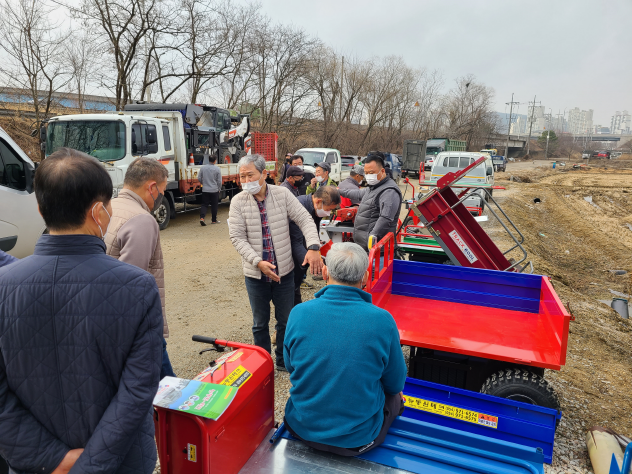 ▲수원시농업기술센터 관계자가 장비를 보급받은 농업인에게 동력운반차 사용법을 교육하고 있다. 수원시 제공 |