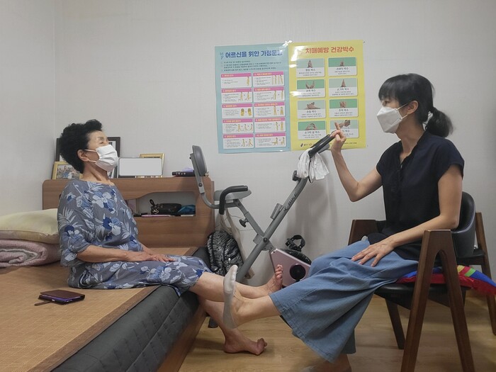 ▲ 한 어르신이 방문건강관리 간호사와 함께 근력 강화 체조를 하고 있는 모습. 용인시 제공 |