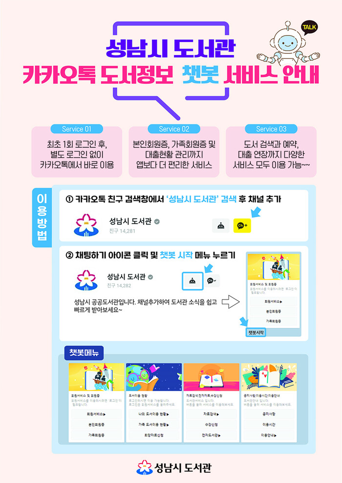 [로컬세계=김병민 기자]경기 성남시는 모바일 메신저 카카오톡을 기반으로 한 ‘도서정보 채팅로봇(챗봇) 서비스’를 시작했다고 4일 밝혔다.