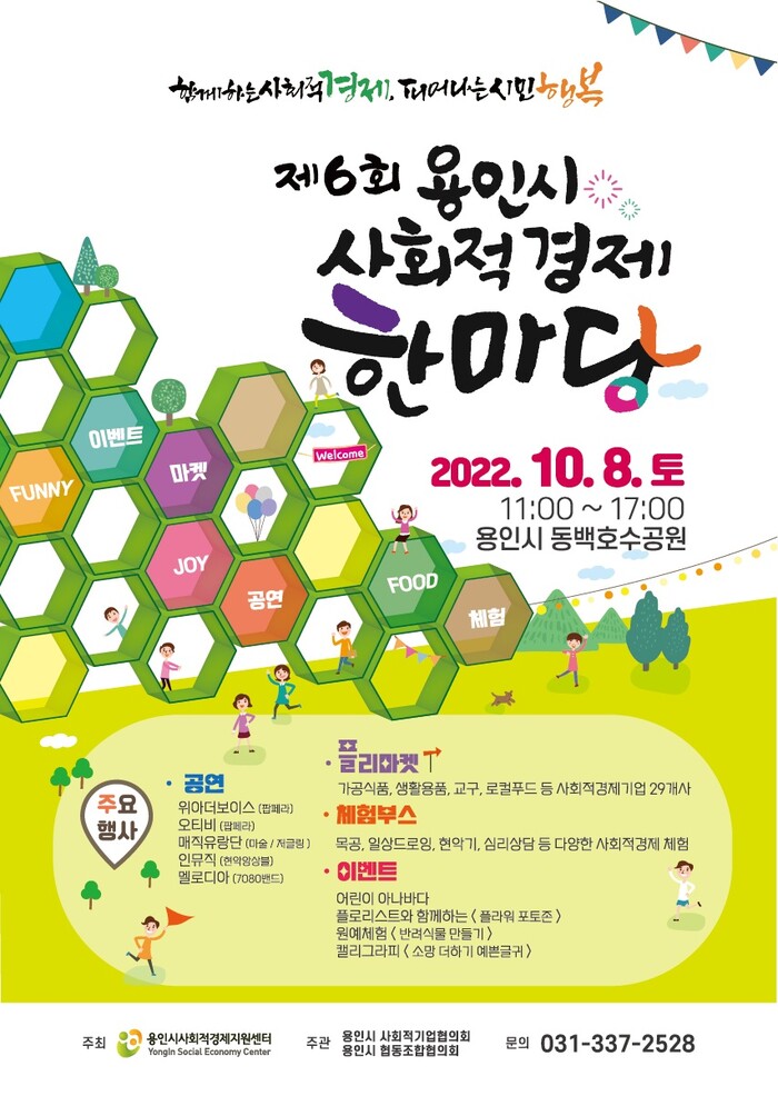 [로컬세계=김병민 기자]경기 용인특례시은 오는 8일 기흥구 동백호수공원에서 관내 사회적경제기업 26곳에서 생산한 제품 등을 선보이는 '사회적 경제 한마당 행사'를 개최한다고 5일 밝혔다.