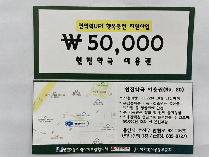 ▲ 상현2동 지역사회보장협의체가 한부모가정 청소년에게 지원한 약국이용권. |