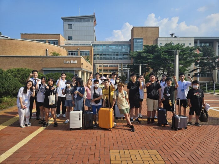 | ▲ 'Dream 용인 with HAFS' 캠프에 멘토와 멘티로 참가하는 용인외대부고 졸업생들과 초등학생들이 캠프 입소 전 함께 기념 사진을 찍고 있다. 용인시 제공 |