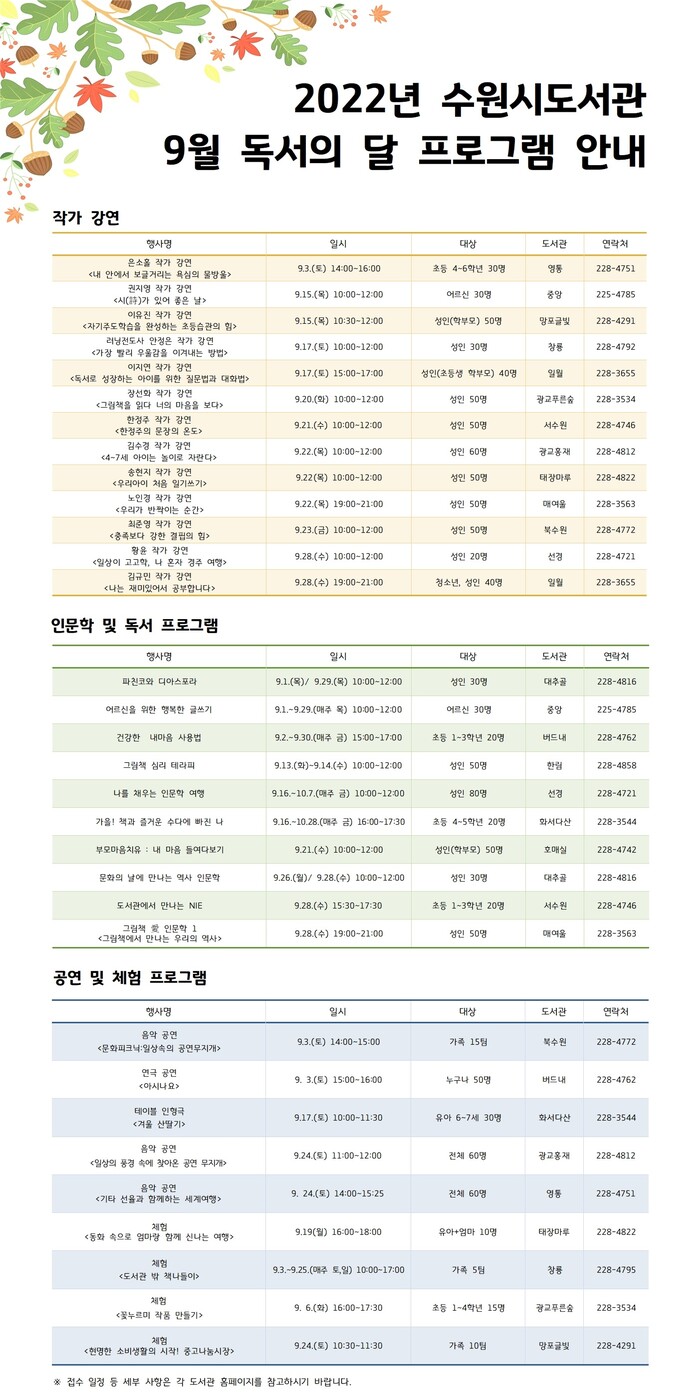 도서관별 자세한 프로그램 일정과 내용은 수원시도서관사업소 홈페이지에서 해당 도서관을 선택한 뒤 ‘독서문화프로그램’을 클릭해 확인할 수 있다.