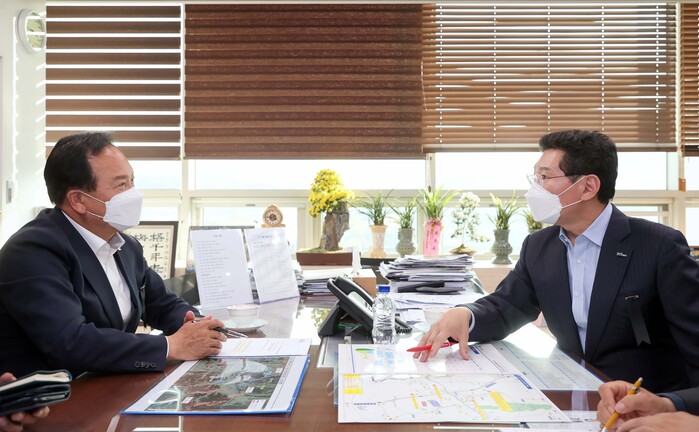 이상일 용인특례시장과 이권재 오산시장은 1일 오후 용인시청 시장실에서 만나 국지도 82호선과 국지도 23호선 해당 구간을 2차선에서 4차선으로 확장하는 데 주력하기로 했다.