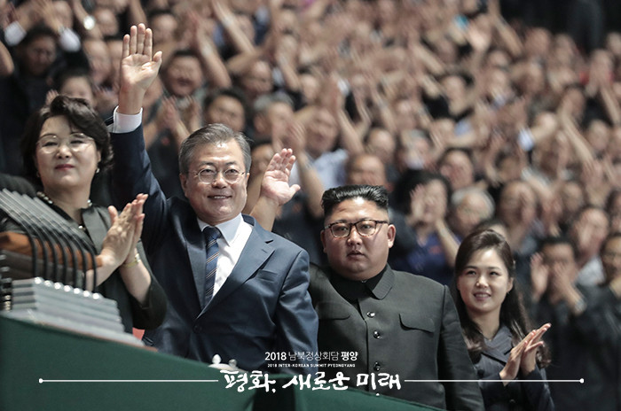 김 위원장은 “오늘의 이 귀중한 또 한걸음의 전진을 위해 평양을 방문한 문재인 대통령의 지칠 줄 모르는 열정과 노력에 진심어린 감사의 뜻을 표하고 싶다”면서 “평양 시민 여러분, 문재인 대통령에게 다시 한 번 뜨겁고 열렬한 박수를 보내 주시기 바란다”면서 문 대통령을 소개했고 이어 문 대통령의 연설이 시작됐다.