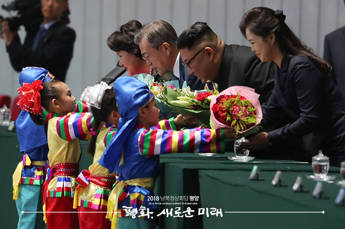 두 정상 부부는 전통 의상을 입은 남녀 화동으로부터 꽃다발을 건네받았다.문 대통령과 김 위원장이 차례로 손을 흔들어 답례하자 장내 함성은 더 커졌다.