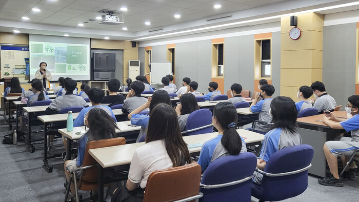 ▲ 상하중학교 학생들이 용인환경센터에서 환경 교육을 받고 있는 모습. |