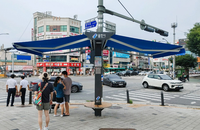 ▲처인구 역북동 명지대 입구 사거리에 설치된 스마트 그늘막. 용인시 제공 |