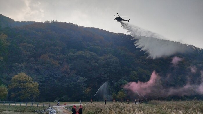 | ▲ 지난 28일 산불진화기계화시스템과 산불진화임차헬기 합동훈련을 하고 있는 모습. 용인시 제공 |