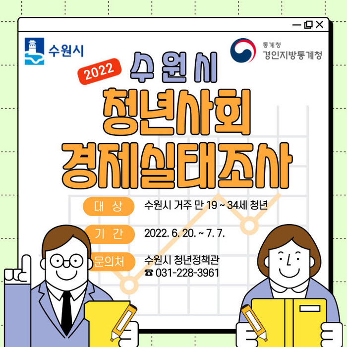 수원시 관계자는 “청년사회경제실태조사로 수원 청년들의 삶을 분석해 청년들에게 실질적으로 필요한 것이 무엇인지 발굴할 것”이라며 “조사원이 방문했을 때 적극적으로 협조해주시길 바란다”고 부탁했다.
