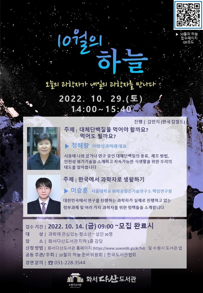 화서다산도서관 통합예약시스템 바로가기 페이지에서 과학자들의 재능기부강연 10월의 하늘’을 클릭해 신청하면 된다. 강연은 화서다산도서관 지하 1층 강당에서 진행된다.