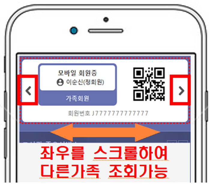 스마트폰에서 도서관 통합 홈페이지를 접속해 해당 기능을 이용하면 정회원으로 등록된 직계가족의 회원번호, 큐알코드 등을 모바일 회원증 형태로 보여준다.