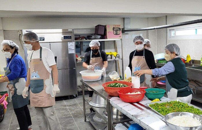 ▲ 이동읍 주민자치위원회 위원들이 홀로 어르신 가정에 전달할 밑반찬을 만들고 있다. |