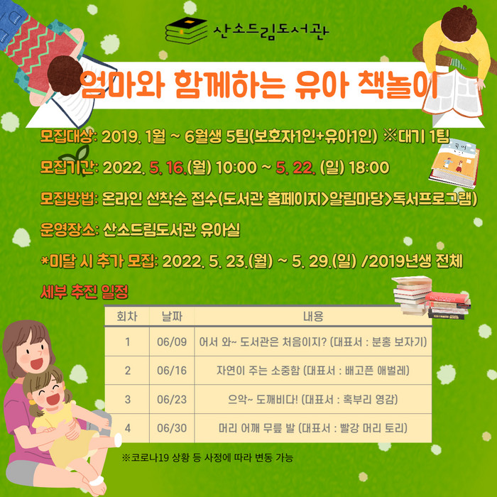 1회차에는 ‘어서 와~ 도서관은 처음이지?’, 2회차는 ‘자연이 주는 소중함’, 3회차는 ‘으악~ 도깨비다!’, 4회차는 ‘머리 어깨 무릎 발’이라는 주제로 관련 그림책을 함께 읽고 책놀이를 진행해 보호자와 유아의 상호작용을 촉진하고 즐거운 책읽기 경험을 쌓아 자연스럽게 책과 친해질 수 있는 계기를 마련할 계획이다.