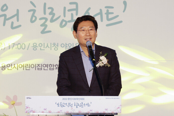 | ▲ 이상일 용인시장이 13일 오후 시청 야외음악당에서 열린 '2022년 보육교직원 힐링콘서트'에 참석해 축사를 하고 있다. 용인시 제공 |