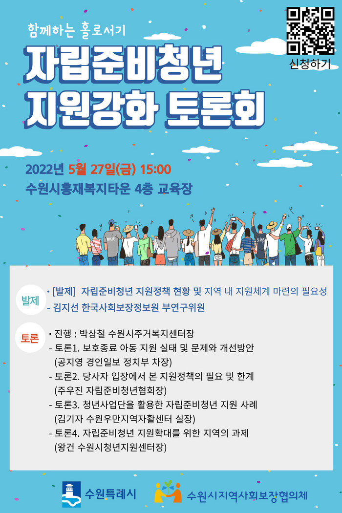 [로컬세계 김병민 기자]경기 수원시가 오는 27일 오후 3시 수원시홍재복지타운 4층 교육장에서 ‘자립준비청년 지원강화 토론회’를 개최한다.