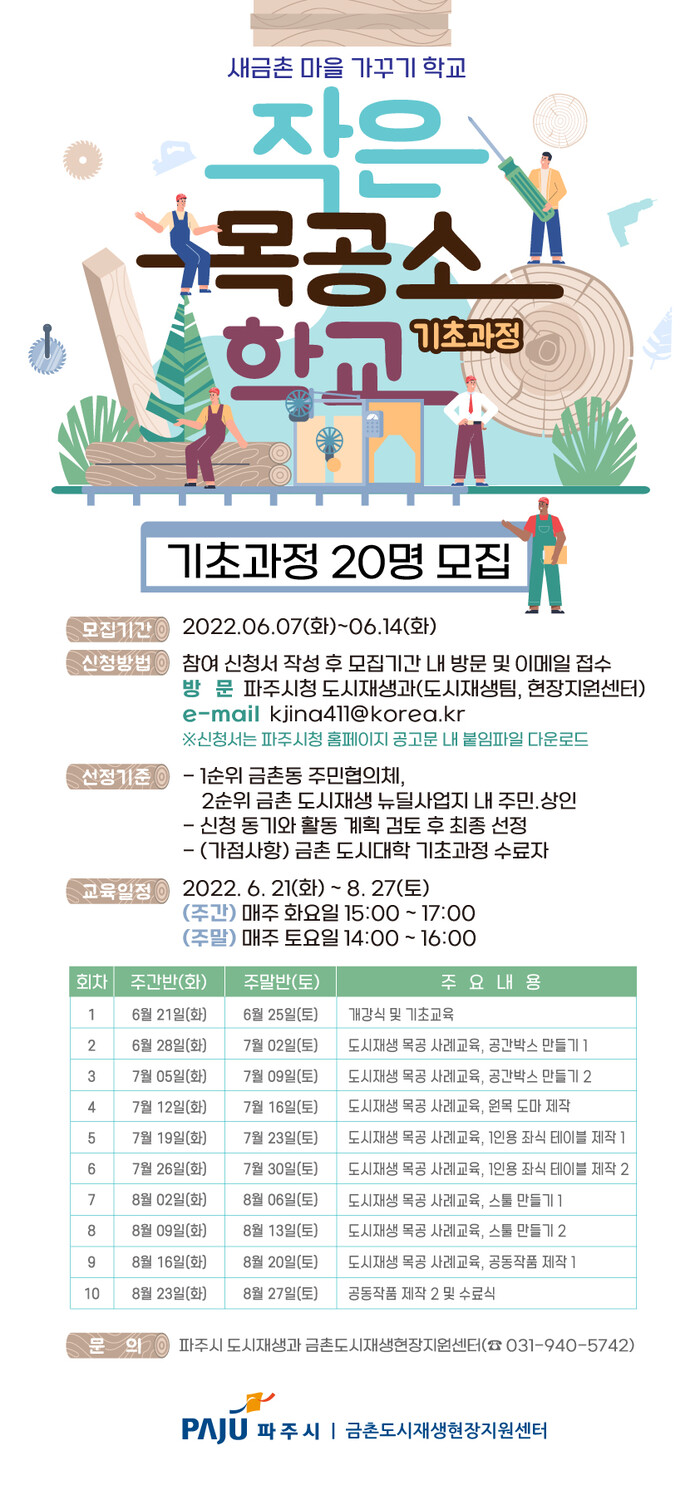 [로컬세계 = 이영원 기자]경기 파주시는 오는 14일까지 '2022 금촌 도시재생 작은 목공소 학교' 교육생 20명(주간반 10명, 주말반 10명)을 모집한다고 9일 밝혔다.