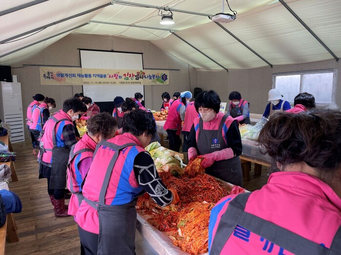 | ▲ 한국생활개선 용인시연합회 소속 여성농업인들이 홀로 어르신을 위한 김장김치를 담그고 있다. 용인시 제공 |