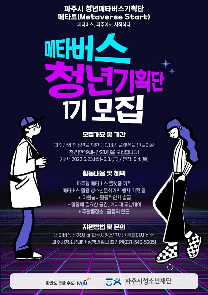 신청대상은 메타버스에 관심있는 만19세~28세 청년이면 누구나 지원이 가능하고, 파주시청소년재단 홈페이지를 통해 신청하면 된다. 활동기간은 6월부터 12월까지이다.