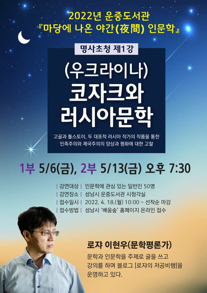 [로컬세계 김병민 기자]경기 성남시는 오는 5월 6일과 13일 오후 7시 30분 분당구 운중도서관 시청각실에서 ‘우크라이나 코자크와 러시아 문학’을 주제로 한 명사 초청특강을 연다.