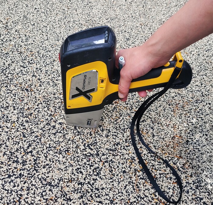 ▲중금속 간이측정기로 놀이터 시설을 측정하는 모습. 용인시 제공 |