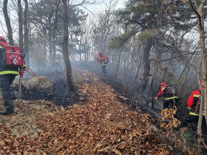 | ▲ 지난 3월 발생한 산불의 잔불을 산불진화대원들이 정리하고 있다. |