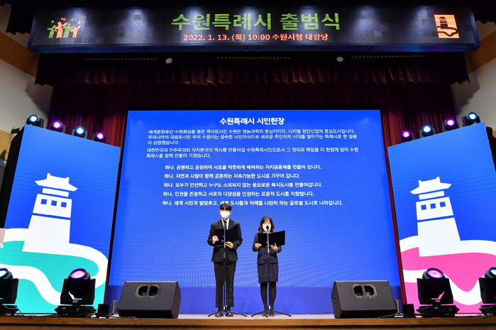 ▲지난 1월13일 수원특례시 출범식에서 시민 대표 2인이 수원특례시민헌장을 낭독하고 있다. |