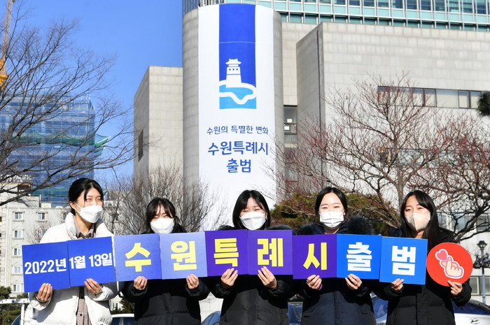 ▲ 수원특례시 출범을 기념해 수원시 공무원들이 피켓을 들고 사진을 촬영하고 있다. |