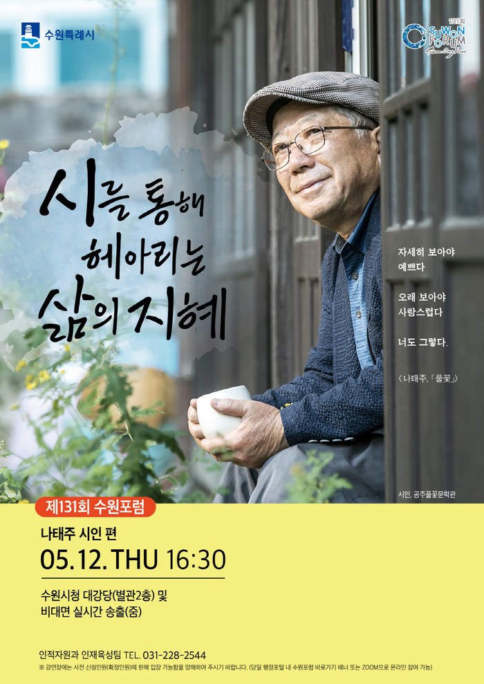 수원시는 5월 12일 오후 4시 30분 ‘시를 통해 헤아리는 삶의 지혜’를 주제로 제131회 수원포럼을 연다. 포럼은 대면·비대면 병행 방식으로 진행된다.