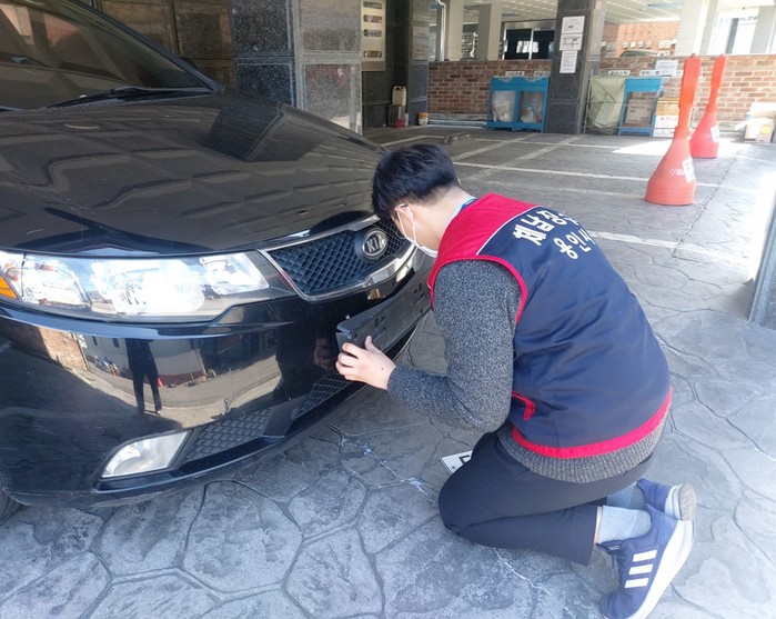 ▲시 관계자가 지방세 체납 차량의 번호판을 영치하고 있는 모습. 용인시 제공 |