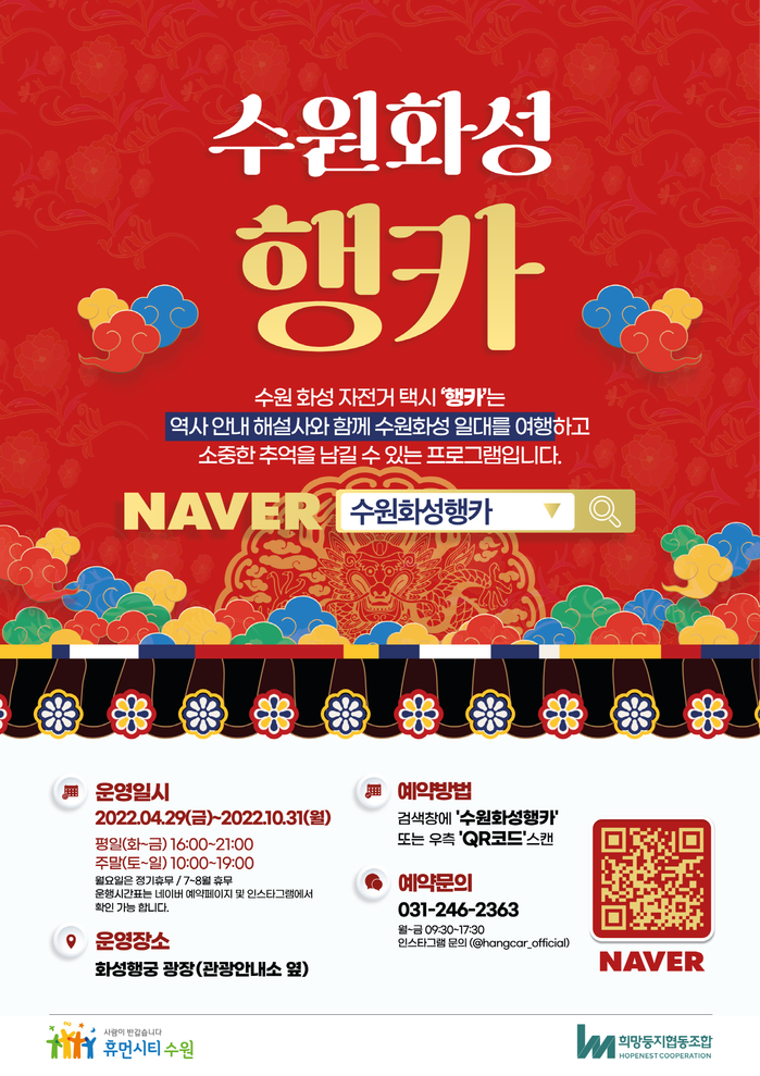수원시 관계자는 “수원화성 자전거 택시 ‘행카’가 플라잉수원, 화성어차, 국궁체험과 함께 수원의 대표적인 체험 관광상품으로 자리매김했다”며 “많은 시민이 행카를 타고 수원화성의 아름다움을 느껴보시길 바란다”고 말했다.