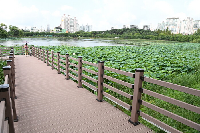 ▲만석공원 수면을 덮은 연잎 위로 데크길이 조성돼 있다. 수원시 제공 |