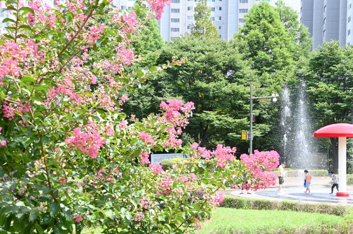 ▲배롱나무 사이로 어린이들이 바닥분수를 즐기고 있는 효원공원. |