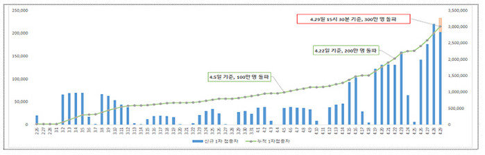 지난 2월 26일 접종을 시작한 이후 39일만인 이달 5일 100만명을 넘었고, 이로부터 17일이 지난 22일 200만명을 돌파했다. 200만명에서 300만명으로 늘어나기까지는 1주일이 걸려, 접종 속도가 점차 빨라지고 있다.