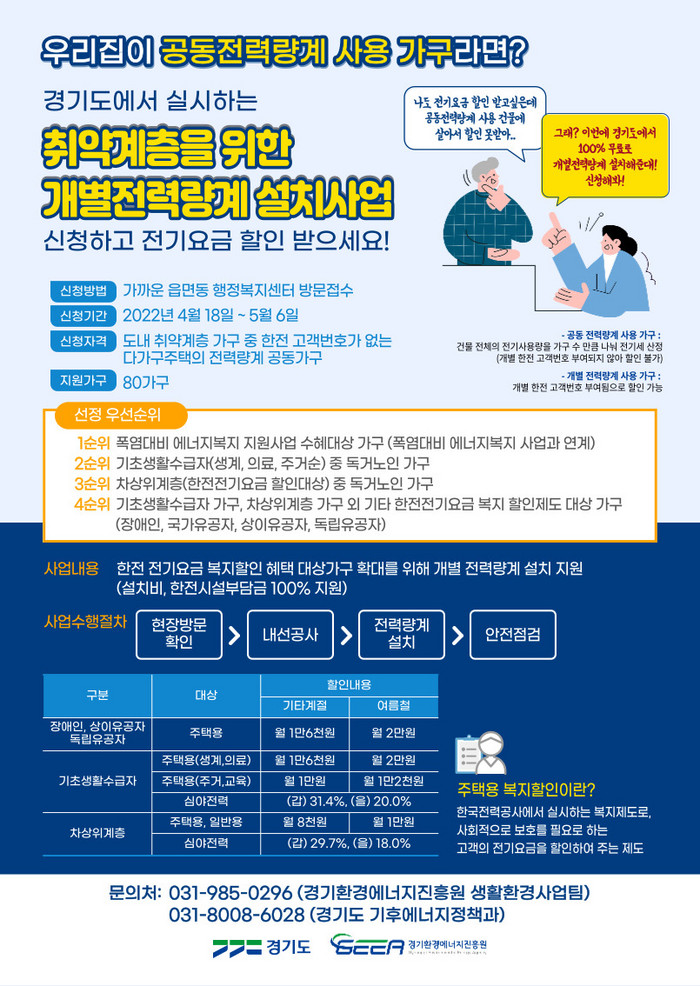 최혜민 도 기후에너지정책과장은 “전기요금 복지할인 대상 도민이 전력량계가 없어 마땅히 받아야 할 혜택을 받지 못하는 일이 없도록 세심히 살피겠다”면서 “이번 사업이 에너지복지 사각지대 해소와 장기적인 에너지복지 실현에 큰 도움이 되길 바란다”고 말했다.