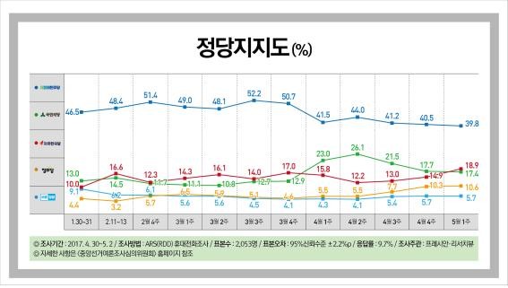 정당지지도는 민주당이 올 들어 최저치인 39.8%를 기록한 가운데 자유한국당은 작년 10월말(17.3%) 이후 최고치인 18.9%로 17.4%에 그친 국민의당을 오차범위 안에서 앞섰다.