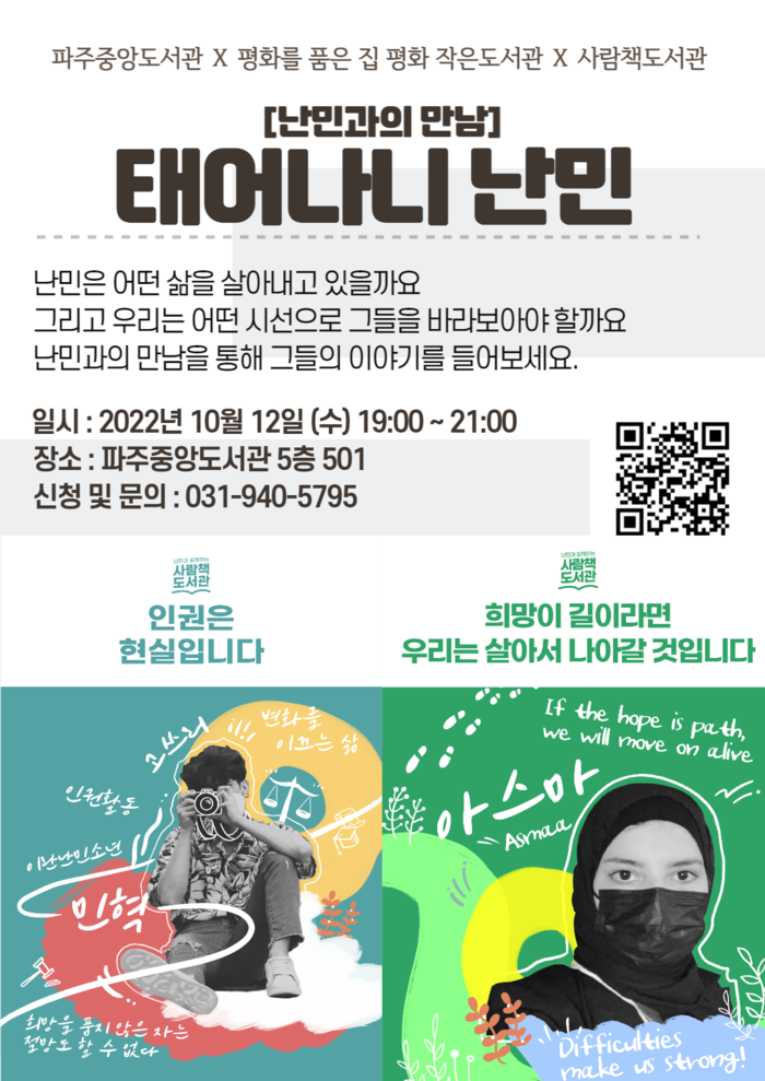 프로그램은 ’평화를 품은 집 평화작은도서관‘, ’사람책도서관‘과 협력해 진행하며, Esmaeilzadeh Shayan(김민혁)씨와 Abdelqader Asmaa Hasn Abdelfatah(아스마)씨가 난민으로 참여할 예정이다.