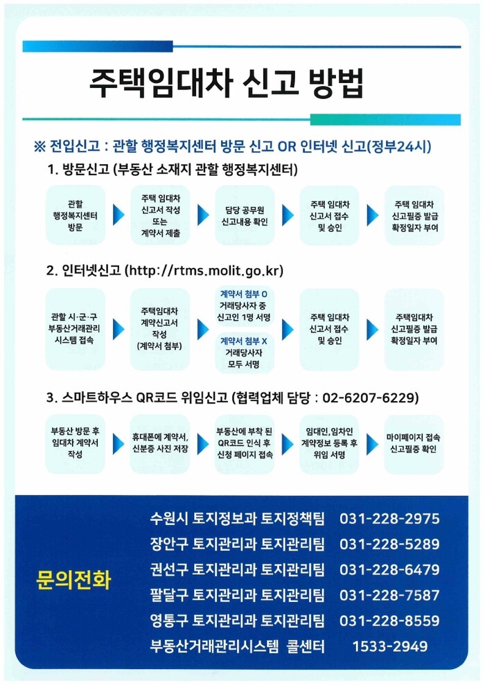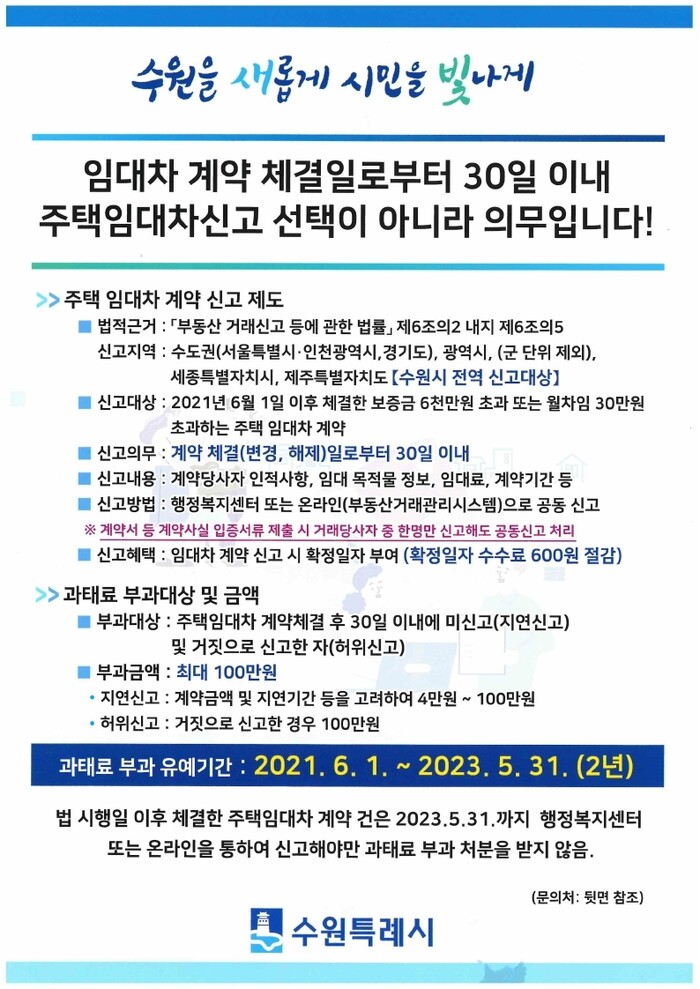 [로컬세계=김병민 기자]경기 수원시는 주택임대차 계약 신고 계도기간이 5월 31일에 종료됨에 따라 신고 대상 안내와 신고 방법 등에 대한 홍보를 강화한다.