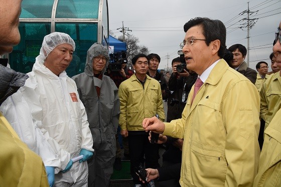 ▲ 황교안 대통령 권한대행 국무총리가 19일 경기도 이천시 AI방역현장을 방문, 보고를 받고 있다. |