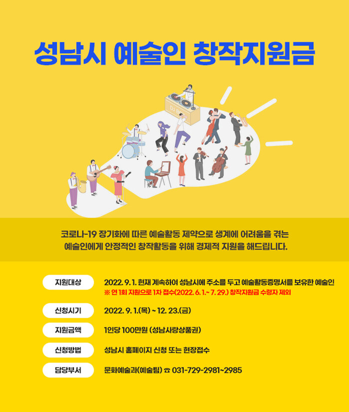 [로컬세계=김병민 기자]경기 성남시는 오는 12월 23일까지 예술인 창작지원금 100만원 지급 신청을 받는다.