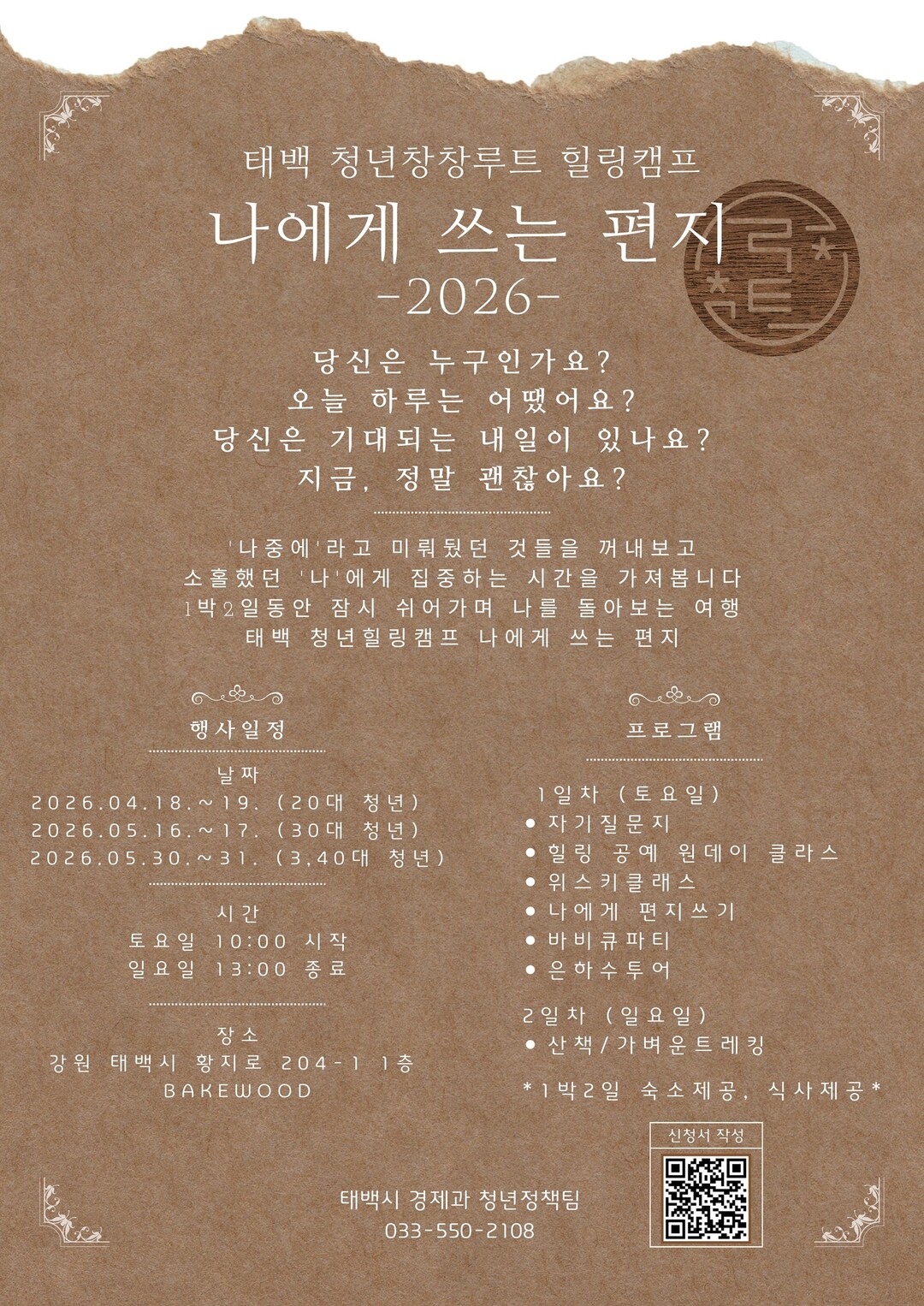 참여 대상은 태백시에 거주하는 18세 이상 49세 이하 청년으로, 1~3차는 차수별 10명, 4차는 24명을 모집한다.