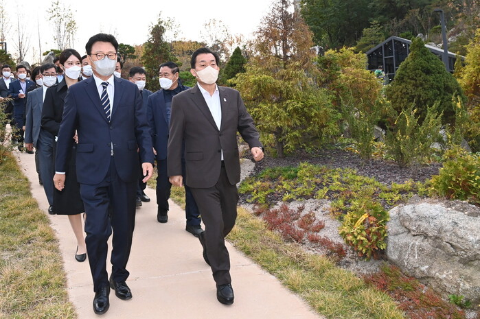 | ▲ 이재준 수원시장(오른쪽)과 박광온 의원이 영흥숲공원을 둘러보고 있다. |