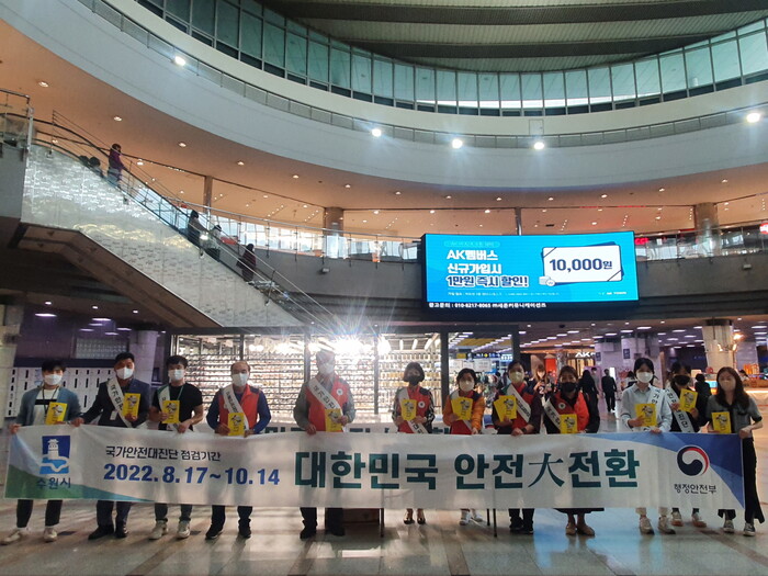 [로컬세계=김병민 기자]경기 수원시가 지난 4일 수원역 2층 대합실 광장에서 ‘2022년 대한민국 안전대전환 캠페인’을 열고, 시민들에게 ‘2022년 국가안전대진단’을 홍보했다.