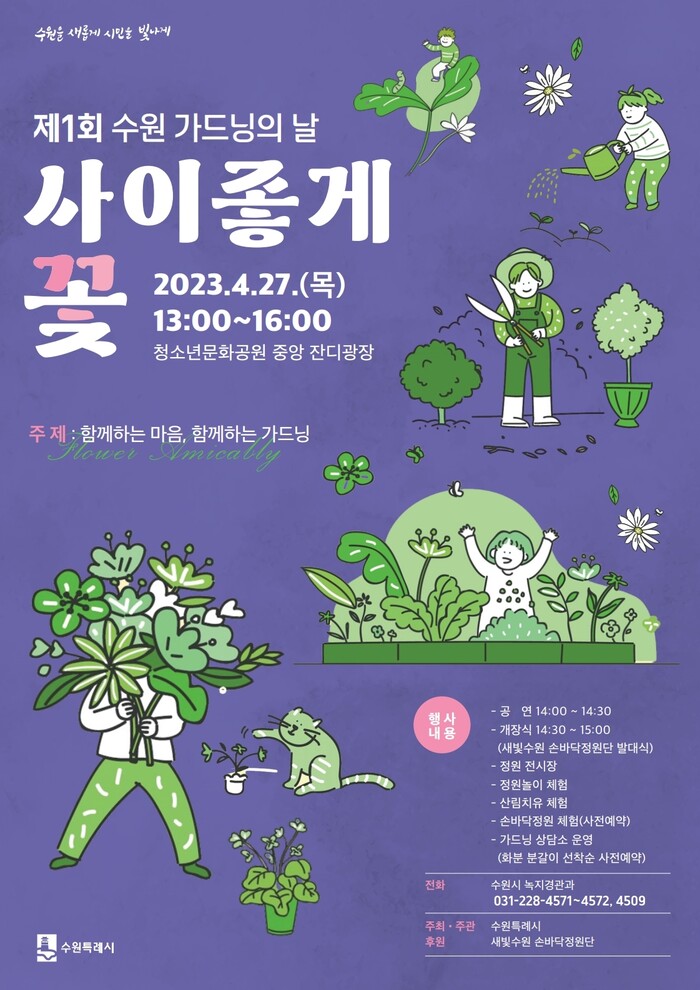 [로컬세계=김병민 기자] ‘손바닥정원 조성사업’을 추진하고 있는 수원시가 오는 27일 오후 1시부터 4시까지 인계동 수원시청소년문화공원 중앙 잔디광장에서 ‘제1회 수원 가드닝의 날-사이좋게 꽃’을 연다.