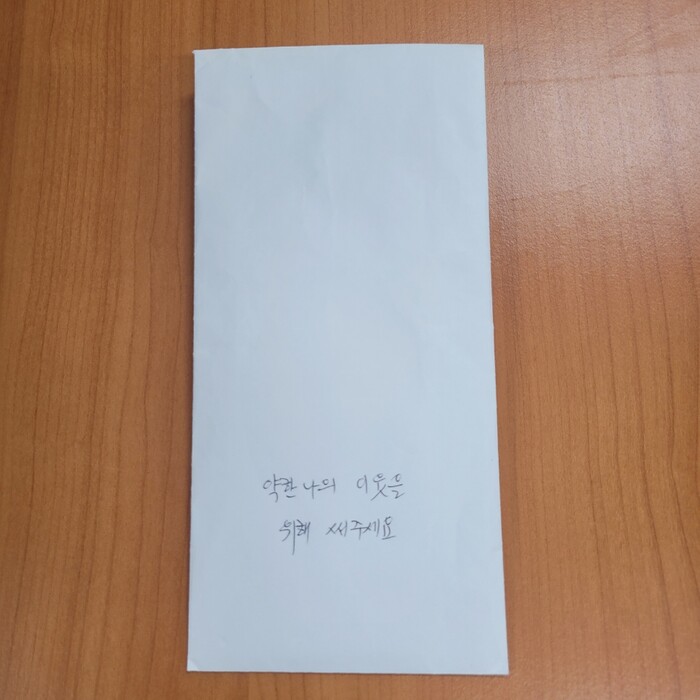 이동읍에서는 익명의 기부천사가 ‘약한 나의 이웃을 위해 써주세요’라고 쓴 봉투를 건네고 홀연히 사라졌다. 봉투에는 현금 168만원이 담겨 있었다.