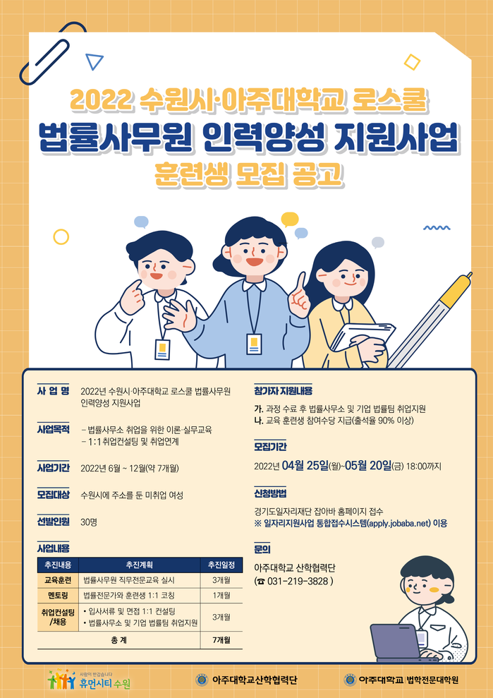 [로컬세계 김병민 기자]경기 수원시가 ‘2022년 수원시·아주대학교 로스쿨 법률사무원 인력양성 지원사업’ 훈련생을 5월 20일까지 모집한다.