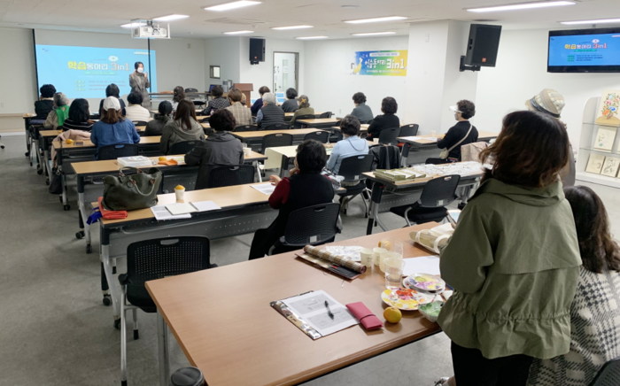 ‘방구석 예술 활동’, ‘복을 부르는 우리 민화’, ‘시그시(시니어와 그림책 읽는 시간)’, ‘위드스푼’ 등 지역 내 4개 학습 동아리가 연합한 ‘다시 On 동아리’를 지원한다.