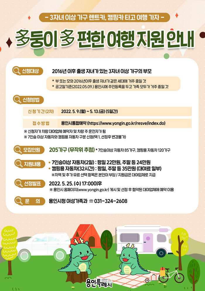 [로컬세계 김병민 기자]경기 용인시는 9일부터 13일까지 여행용 자동차 대여료를 지원받을 다둥이 가족을 추가 모집한다.