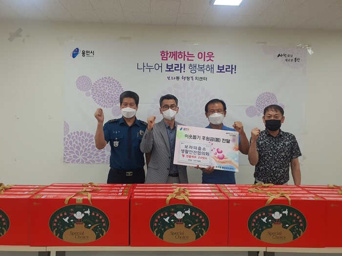 [로컬세계=김병민 기자]경기 용인특례시 기흥구 보라동은 보라파출소 생활안전협의회(회장 유영근)가 저소득 주민에게 전해달라며 햄 선물세트 24개를 기탁했다고 16일 밝혔다.