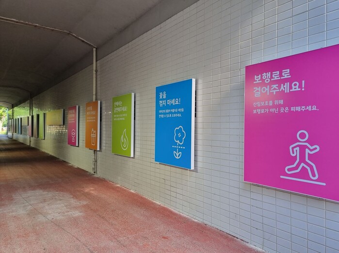 이번에 새 단장을 마친 대지산통로 보행로는 인근 아파트 주민들과 어린이들이 자주 지나는 길로, 강남대 학생들은 이곳에 ‘범죄예방 환경디자인(CPTED·디자인을 통한 도시환경 개선으로 범죄를 예방하는 것)’ 방식을 적용해 디자인한 작품 32점을 전시했다.
